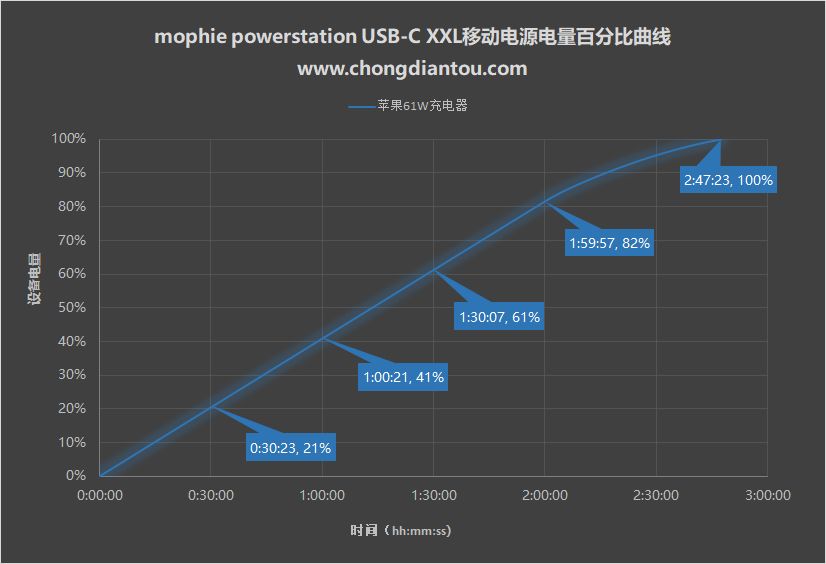 首先是mophie powerstation USB-C XXL移动电源的电量变化。前两个小时,基本上每半个小时可以充进20%左右的电量;在充电2个小时时,电量达到了82%;充满花了近2小时48分钟。