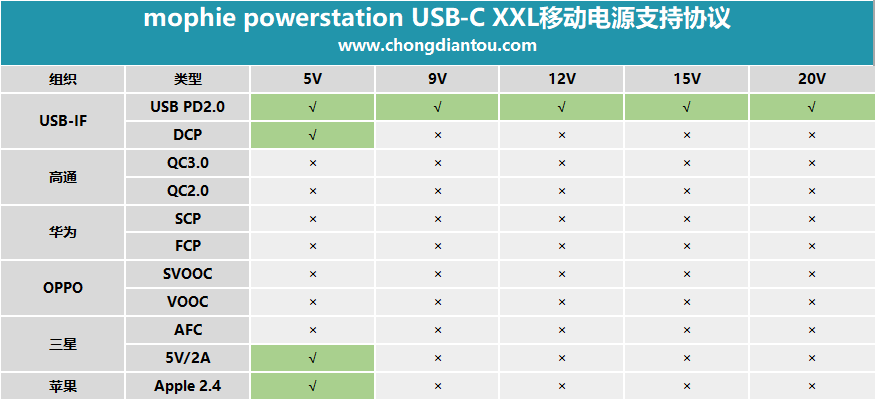 欣赏完mophie powerstation USB-C XXL移动电源的外观后,接下来我们来看看它的性能如何。小编会依次从协议检测、兼容性、最大输出、满载温度、充电测试这五方面进行,随我一起来看看吧。