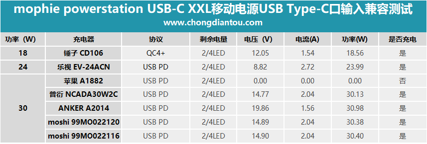 从图表中可以看出,除了苹果30W充电器不能充它之外,其余的充电器都能充,并且都是以充电器最大的功率对它充电。