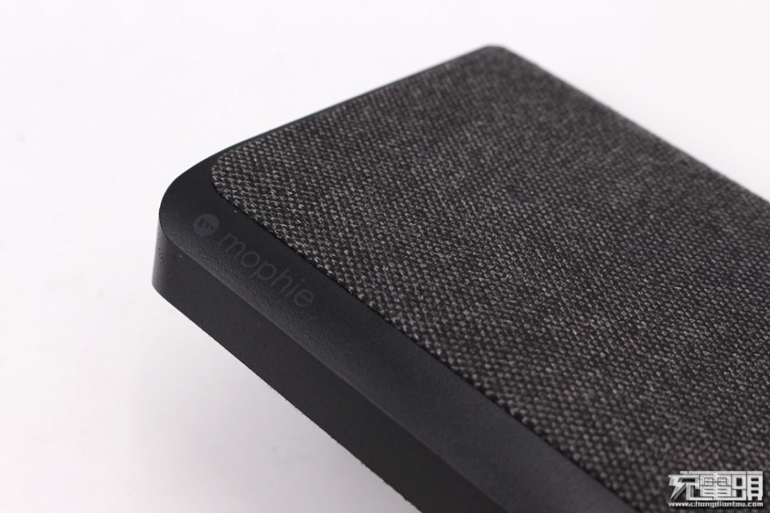 这层织物不是全覆盖设计,露出了一小部分PC材质,而这一部分也加入了斜面设计,让整个移动电源的造型看起来并不单调,在斜面上印有“mophie”的logo。