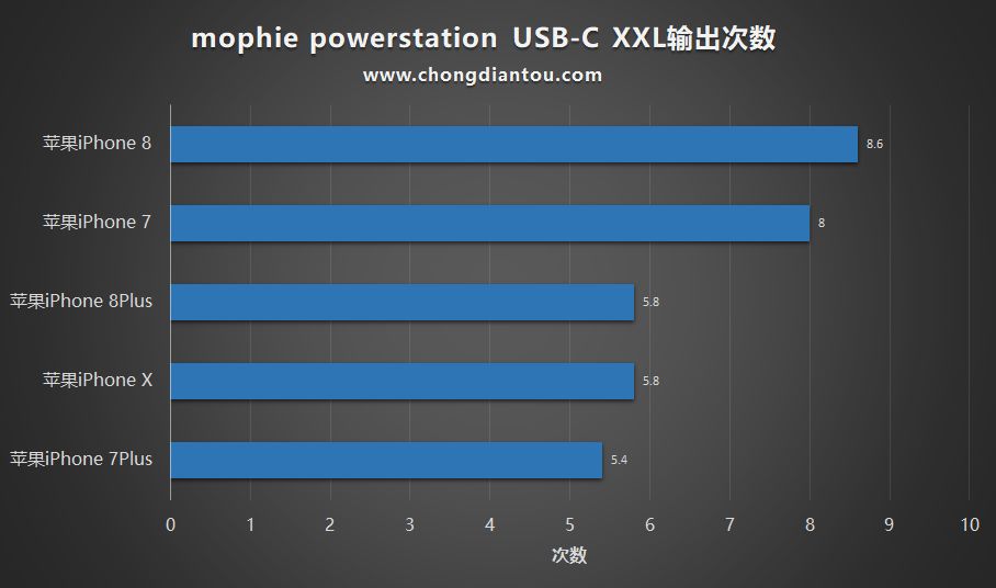 其中,能给iPhone 8充最多次,为8.6次;iPhone 7Plus最少,为5.4次。(数据仅作参考)
