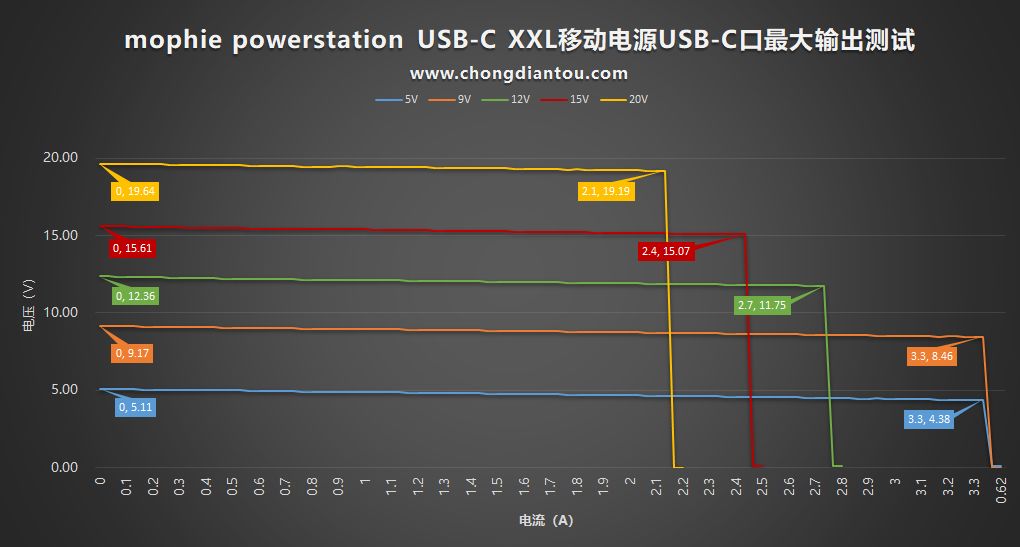 首先是USB-C口,依次设置了充电器的五个电压档位,电流从0A开始递增,每次递增0.1A。5V和9V档位最大输出电流为3.3A,12V档位最大输出电流为2.7A,15V档位最大输出电流为2.4A,20V档位最大输出电流为2.1A,比标称值大了0.6A;最大功率可达40.29W(19.19V/2.1A),比标称30W(20V/1.5A)功率大了10.29W,预留了10W左右的余量。