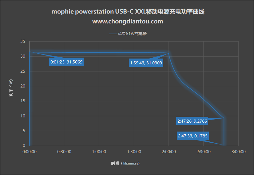 再来看看mophie powerstation USB-C XXL移动电源充电时的功率变化。在极为短暂的适配之后,功率直接上到了31W左右,并一直以31W左右的功率充电,维持了近两个小时。在两个小时后,电量达到80%,功率随后逐渐下降,一直下降到9W左右;在2小时47分钟时,电量充满,功率随即直线掉落到近0W。