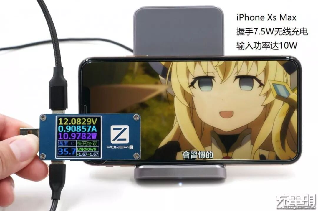 iPhone XS Max握手7.5W无线充电协议,无线充电器输出功率达10.97W。