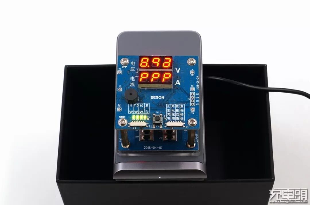 使用无线充电治具进行测试,三个功率档位全部亮灯并显示PPP、代表三个档位都PASS,可以支持普通5W、苹果7.5W、三星10W无线充电。