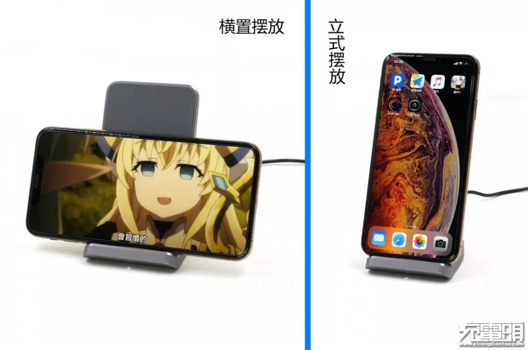 使用iPhone XS Max手机分别横置摆放和立式摆放在无线充电器上,均能充电。
