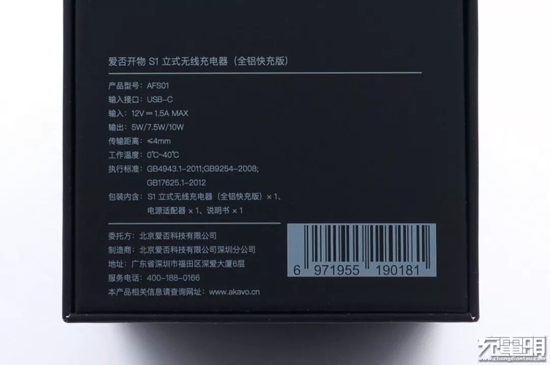 爱否无线充电器包装盒采用哑光黑色硬纸盒,爱否LOGO位于中间,亮面材质十分突出。