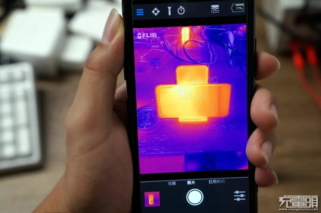 在充电47分钟左右使用FLIR红外热成像仪测试温度,手机温度为36.6℃,爱否无线充温度为34℃,由于使用了一体铝壳体,所有的发热均匀传达到整个壳体散热,效果十分不错。