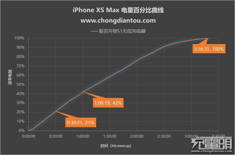 iPhone XS Max电量变化方面,半小时21%,一小时42%,全程耗时3小时18分。