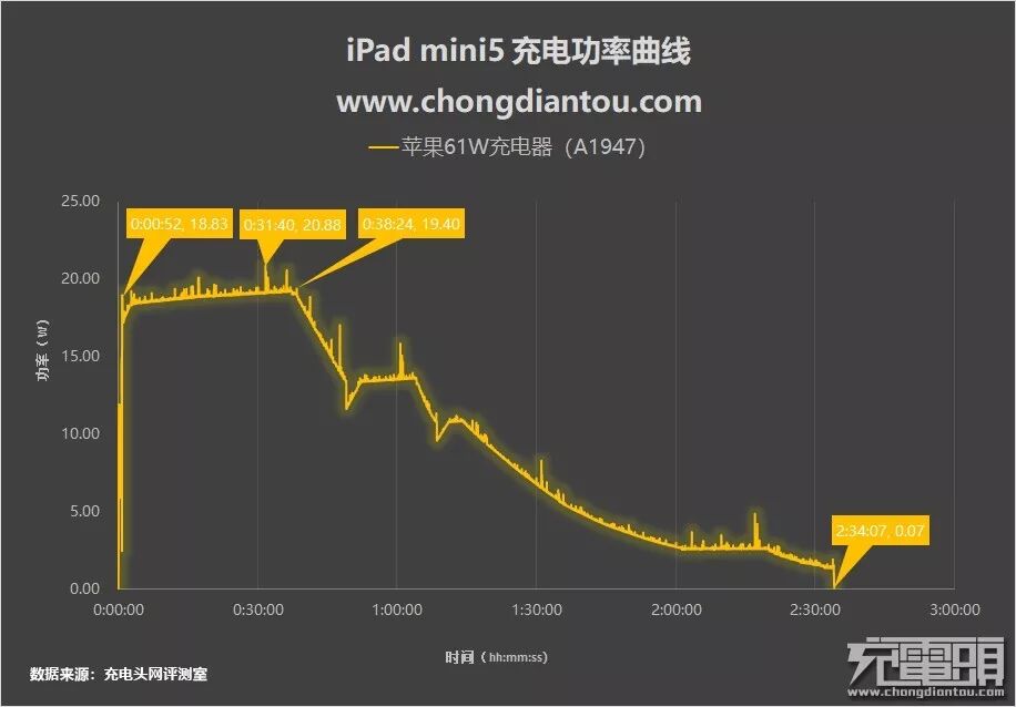 从上图中可以看出,在0%没电关机状态时,它握手了5V Apple 2.4A充电模式,不到1分钟自动开机后转换成了以USB PD快充进行充电。在充电52秒时,它的功率达到了18.83W;随后功率回落并逐渐上升,在38分钟左右达到了19.4W;紧接着功率逐渐下降,在经过几次较大波动后于2小时34分完成充电,功率落至0.07W。另外全程充电最功率达20.88W。