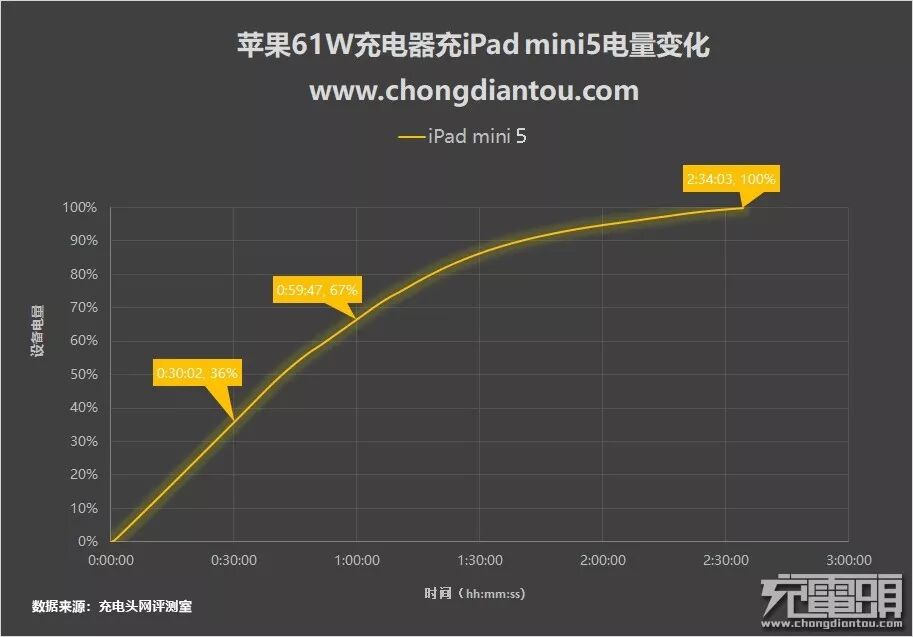 电量变化方面,iPad mini5的电池容量为19.1Wh,充电半小时电量充至36%,;1小时充至67%,随着电池饱和度越来越高,功率逐步下降,后续电池容量增加的速度也开始放缓,最终充满耗时2小时34分钟。