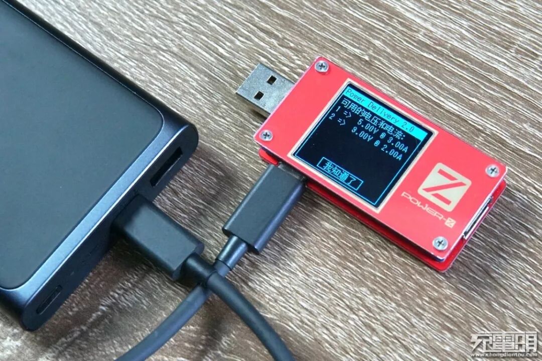 使用ChargerLAB Power-Z KT001测试仪读取USB-C接口PDO报文,屏幕显示支持5V/3A、9V/2A两个PD档位输出。