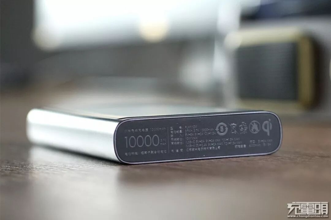 移动电源底部详细参数以及通过了“qi”认证的标志,采用的是浮印工艺,有明显的凸起感。