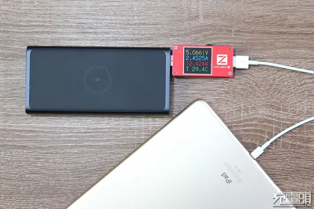 充iPad Air2,电压5.06V,电流2.45A,功率12.42W,Apple 2.4A协议充电。