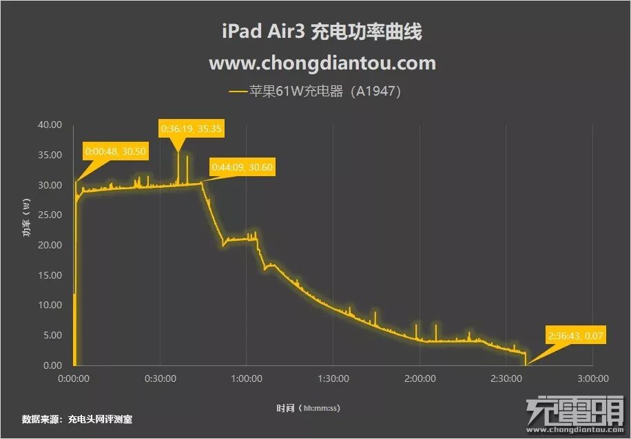 电量变化方面,iPad Air3的电池容量为30.2Wh,充电半小时电量充至36%,1小时充至68%,随着电池饱和度越来越高,功率出现大幅度下降,后续电池容量增加的速度也开始放缓,最终充满耗时2小时36分钟,充电倍率大约为0.7C。