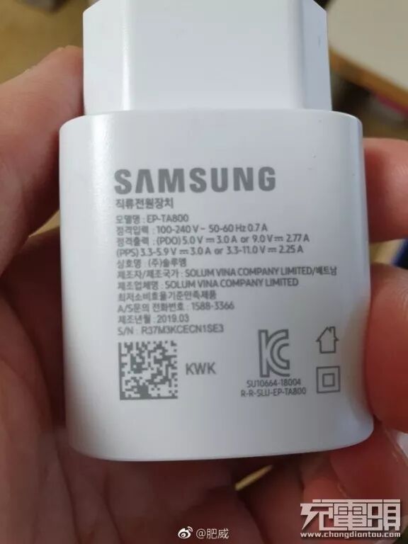 现在下面我们来看看全新的25W充电器。三星称新的25W适配器叫Super Fast Charging,兼容PD3.0,根据博主肥威拍摄的新款充电器图片所示,这款新的白色充电器型号为EP-TA800,输出为5V/3A 9V/2.77A,最大功率25W,同时还支持PPS功能。充电器为Type-C 接口输出。