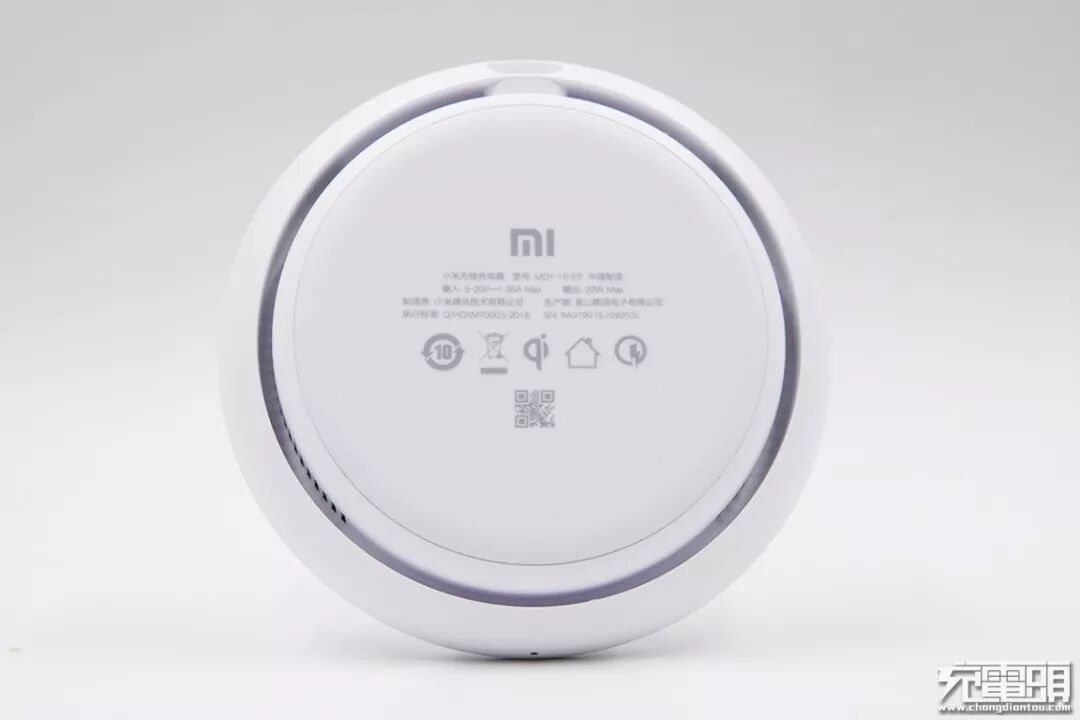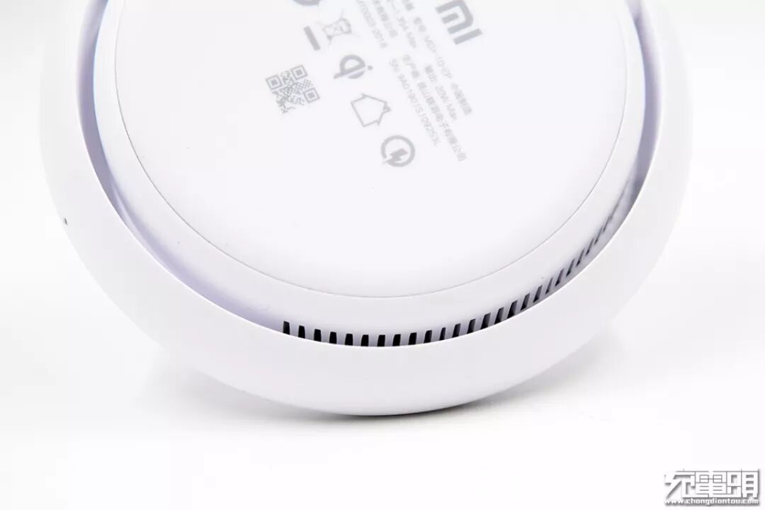 无线充电器侧面与底部采用的是PC材质,但是底部有镶嵌一块液态硅胶用来防滑并在上面印制了产品规格参数。参数与包装盒上印制的完全一致。型号:MDY-10-EP;输入:5V-20V 1.35A Max;输出:20W Max。