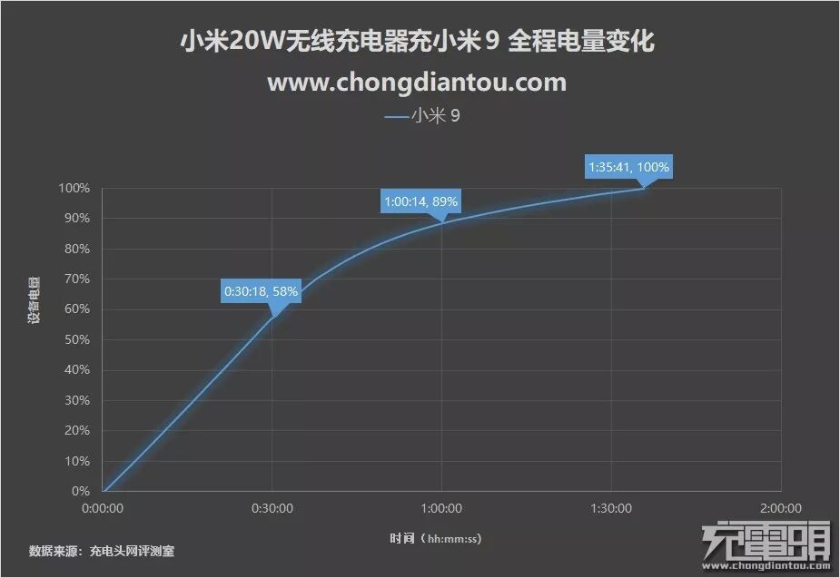 我们再来看看小米 9手机的电量变化情况。前6分钟小米 9开启了20W无线充电模式,充进11%的电量;充电30分钟时电量为37%;充电1小时电量为71%,全程耗时1小时51分钟,表现不错。