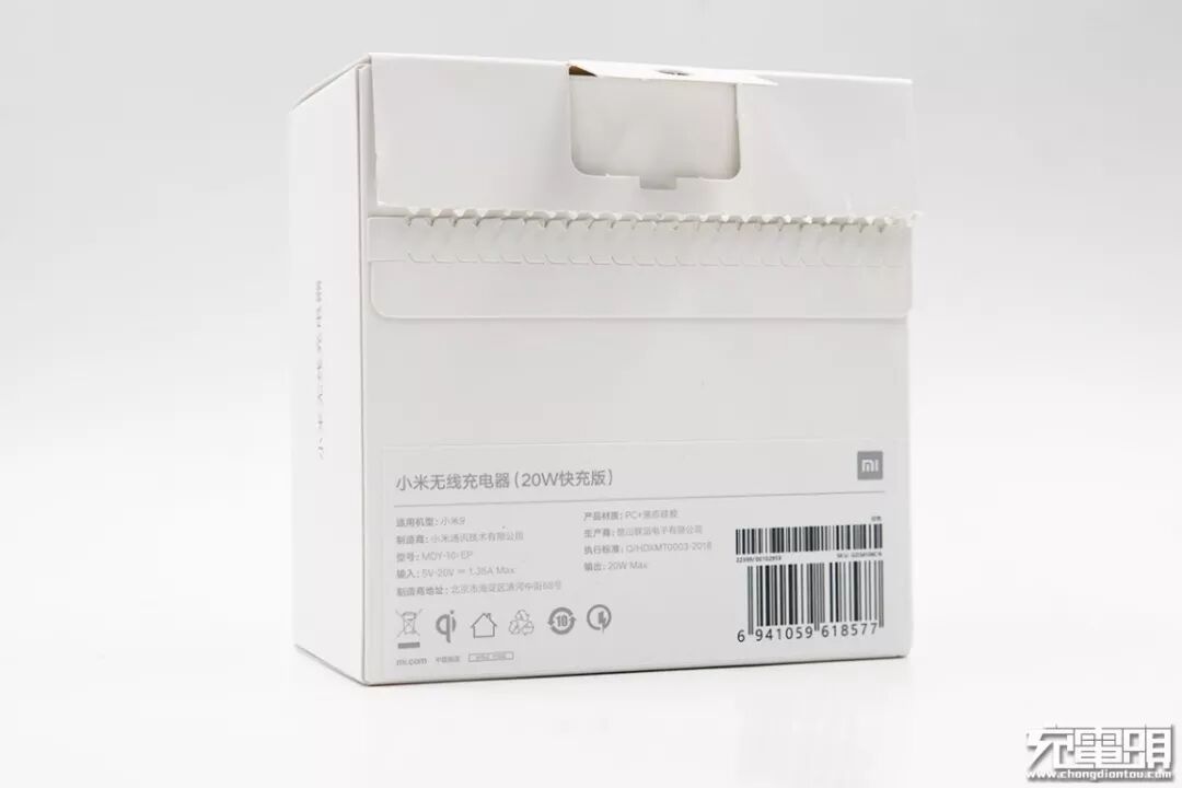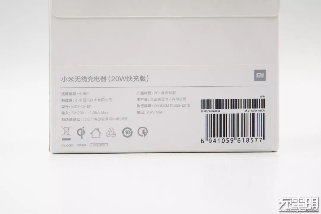 背面下方还印制产品参数:产品名称:小米无线充电器(20W快充版);适用机型:小米9;产品材质:PC+液态硅胶;型号:MDY-10-EP;输入:5V-20V 1.35A Max;输出:20W Max。再往下还有各类认证的标识:Qi认证、高通QC认证等。