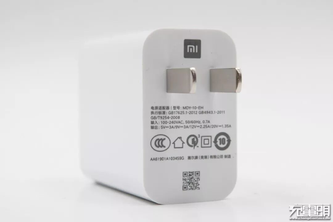 附带的27W电源适配器采用两脚不可折叠插脚。型号:MDY-10-EH,输入:100-240V,50/60Hz,0.7A;输出:5V3A、9V3A、12V2.25A、20V1.35A。通过了3C、QC3.0等认证。小米9标配的充电器也是这一款。