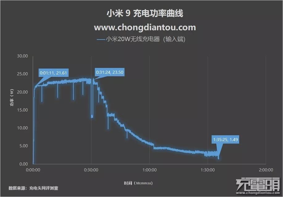 从图表中可以看出,小米无线充电器输入端功率在经过短短数秒时间便直接上升到近22W,小米 9手机开启20W无线充电模式;此模式维持了近6分钟,随后功率掉落至12W左右并稳定维持了一小段时间;接着功率开始逐渐上升,直到1小时05分功率达到近14W;最后功率逐渐减小,在1小时51分钟时减至1W左右,充电完成。