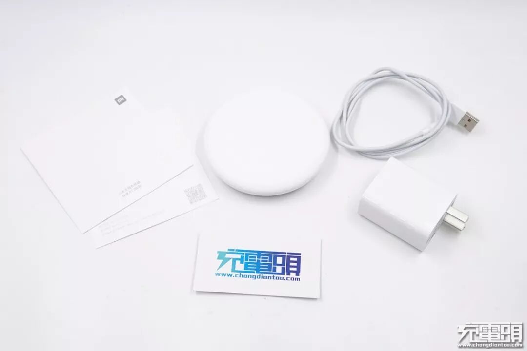 撕掉包装盒的“拉链”,包装盒内有小米无线充电器、电源适配器、数据线、说明书。因为是套装版,比标准版多了一个适配器。