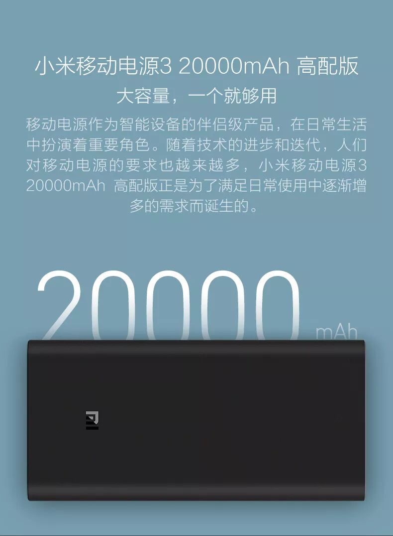 小米移动电源3高配版是小米推出的第三代移动电源,功率大,容量足。它带有3个USB接口,均支持多种快充协议,其中USB-C接口支持45W输入,40W输出,官方称使用45W充电器4.5小时即可充满20000mAh,相当快速。其USB-C口强大的输出能力除了充手机之外,还可以为MacBook、小米笔记本、ThinkPad、DELL XPS等笔记本充电。