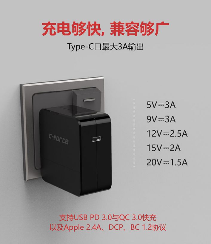 性能方面,C-FORCE 30W PD充电器并没有像它的外观一样的低调,它支持USB PD、QC快充,能给市面上大多数设备快充,包括手机、平板、游戏掌机、笔记本电脑等,在经过了28款数码产品、19款移动电源的兼容性测试中,C-FORCE 30W PD充电器表现满分,全部兼容可充电。另外,为避免瞬间功率过高而导致意外,C-FORCE 30W PD充电器还预留了2W~6W的余量,为你的安全保驾护航。