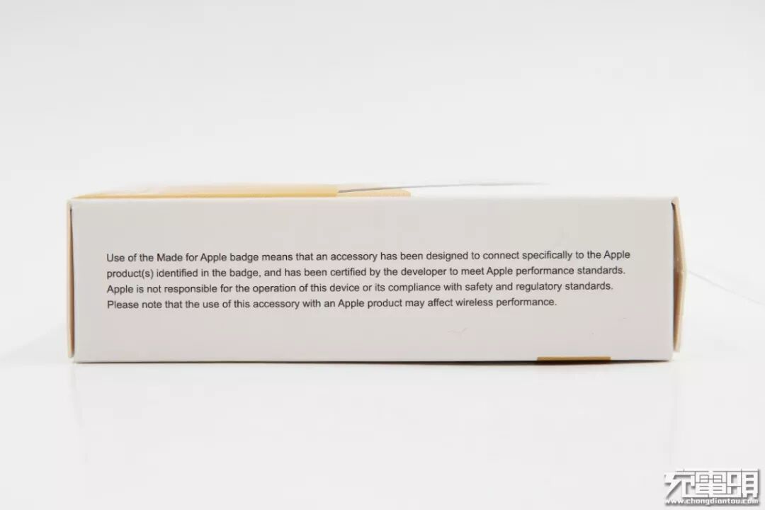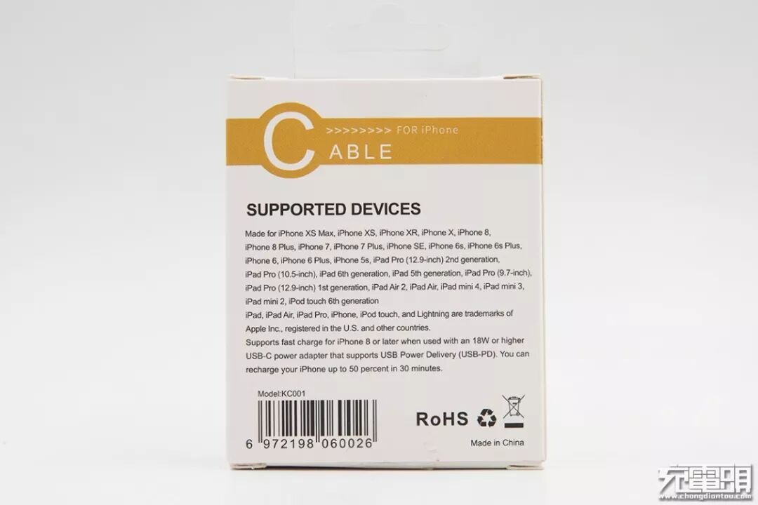 纸盒背面有兼容性列表,支持iPhone 5之后的所有iPhone机型、iPad mini以后所有的iPad机型及iPod touch 6。