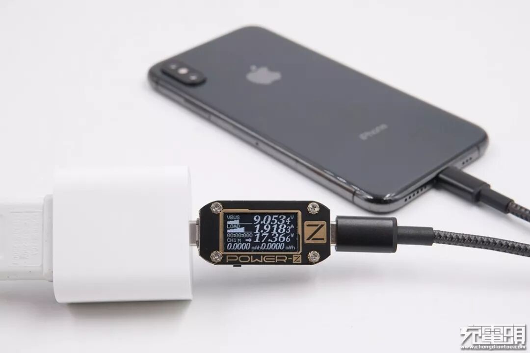 使用趣评测USB-C to Lightning数据线+苹果18W PD充电器给iPhone XS充电,电压9.05V,电流1.91A,功率17.34W,开启PD快充。