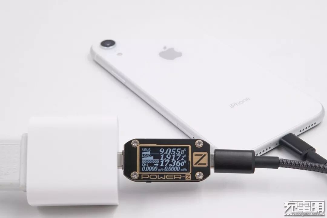 使用趣评测USB-C to Lightning数据线+苹果18W PD充电器给iPhone XR充电,电压9.05V,电流1.91A,功率17.36W,开启PD快充。