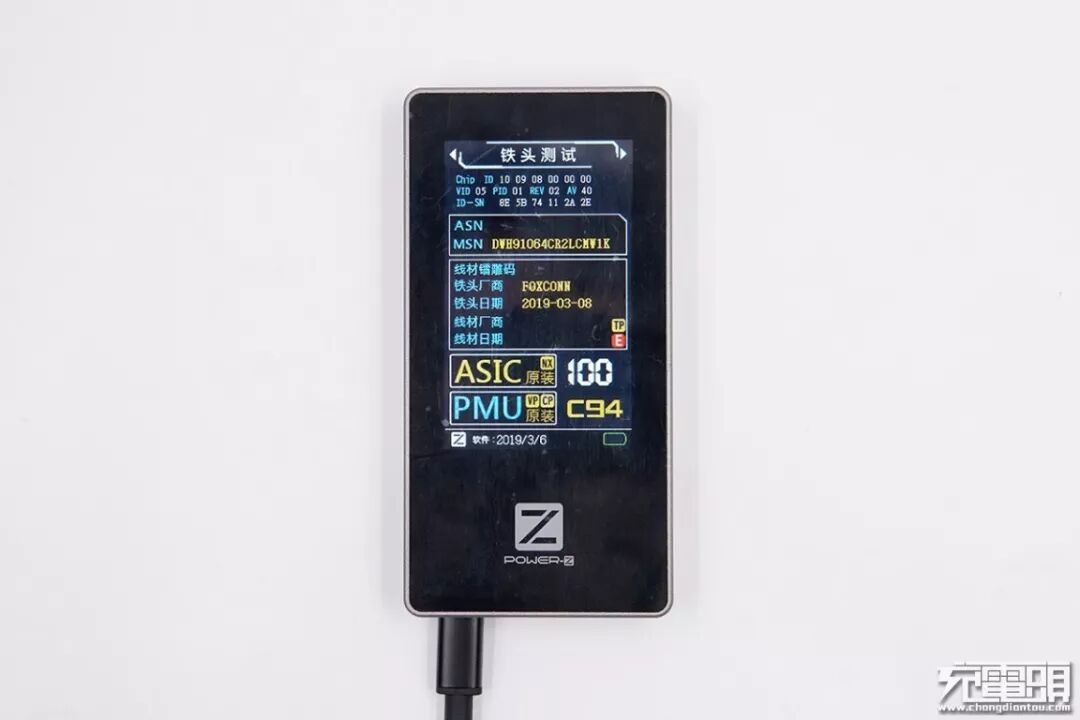 使用ChargerLAB Power-Z MF001测试仪对趣评测USB-C to Lightning数据线进行端子检测,测得该端子的ASIC与PMU皆为原装,端子型号C94,评分为100满分。