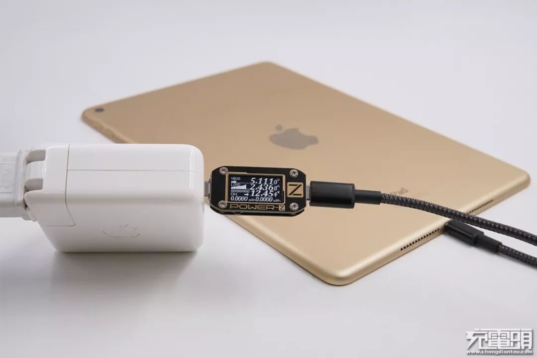 使用趣评测USB-C to Lightning数据线+苹果61W PD充电器给iPad Air2充电,电压5.11V,电流2.43A,功率12.45W,iPad Air2不支持PD快充,但支持Apple 2.4A协议充电,当前开启Apple 2.4A协议充电模式。