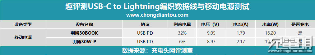 目前市面上带Lightning输入接口并且支持PD快充的移动电源较少,小编找来两款羽博PD移动电源进行测试,趣评测USB-C to Lightning编织数据线均能为它们激活开启PD快充。