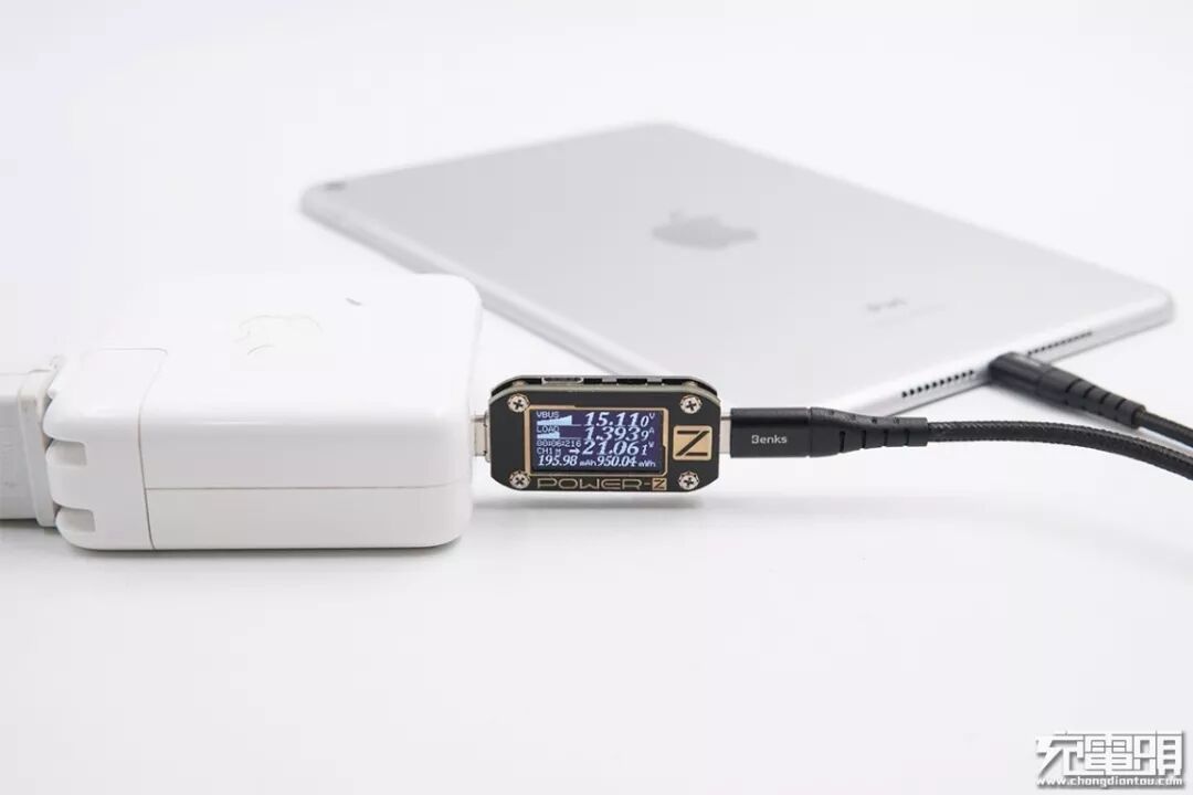 使用邦克士USB-C to Lightning数据线+苹果61W PD充电器给iPad mini5充电,电压15.11V,电流1.39A,功率21.06W,开启PD快充。