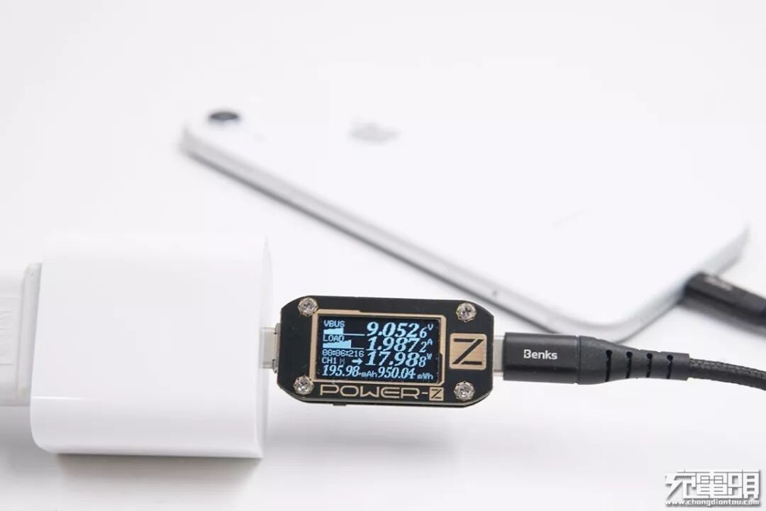 使用邦克士USB-C to Lightning数据线+苹果18W PD充电器给iPhone XR充电,电压9.05V,电流1.98A,功率17.98W,开启PD快充。
