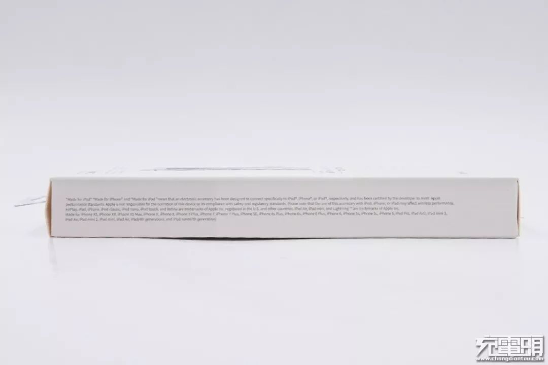 盒子侧面印有MFi说明及产品兼容性列表,支持iPhone 5之后的iPhone机型、iPad第四代之后的iPad的机型和iPod Nano 7。
