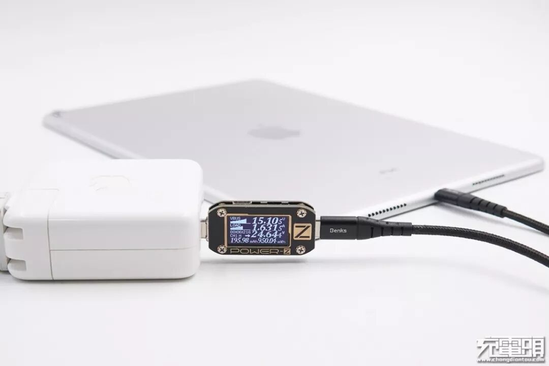 使用邦克士USB-C to Lightning数据线+苹果61W PD充电器给iPad Pro 10.5英寸充电,电压15.1V,电流1.63A,功率24.64W,开启PD快充。
