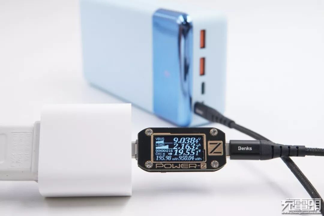 使用邦克士USB-C to Lightning数据线 +苹果18W PD充电器给羽博30W-P移动电源充电,电压9.03V,电流2.16A,功率19.55W,开启PD快充。