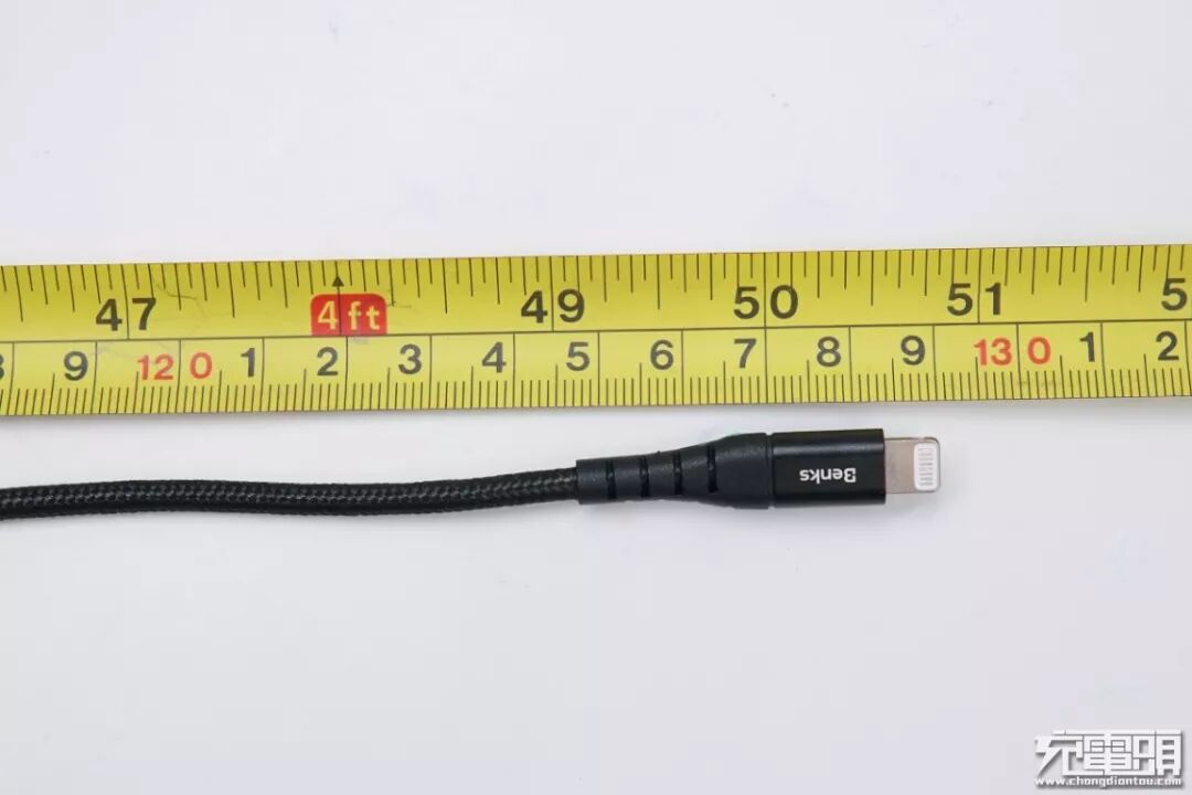 使用卷尺实测邦克仕USB-C to Lightning数据线长度为129cm。
