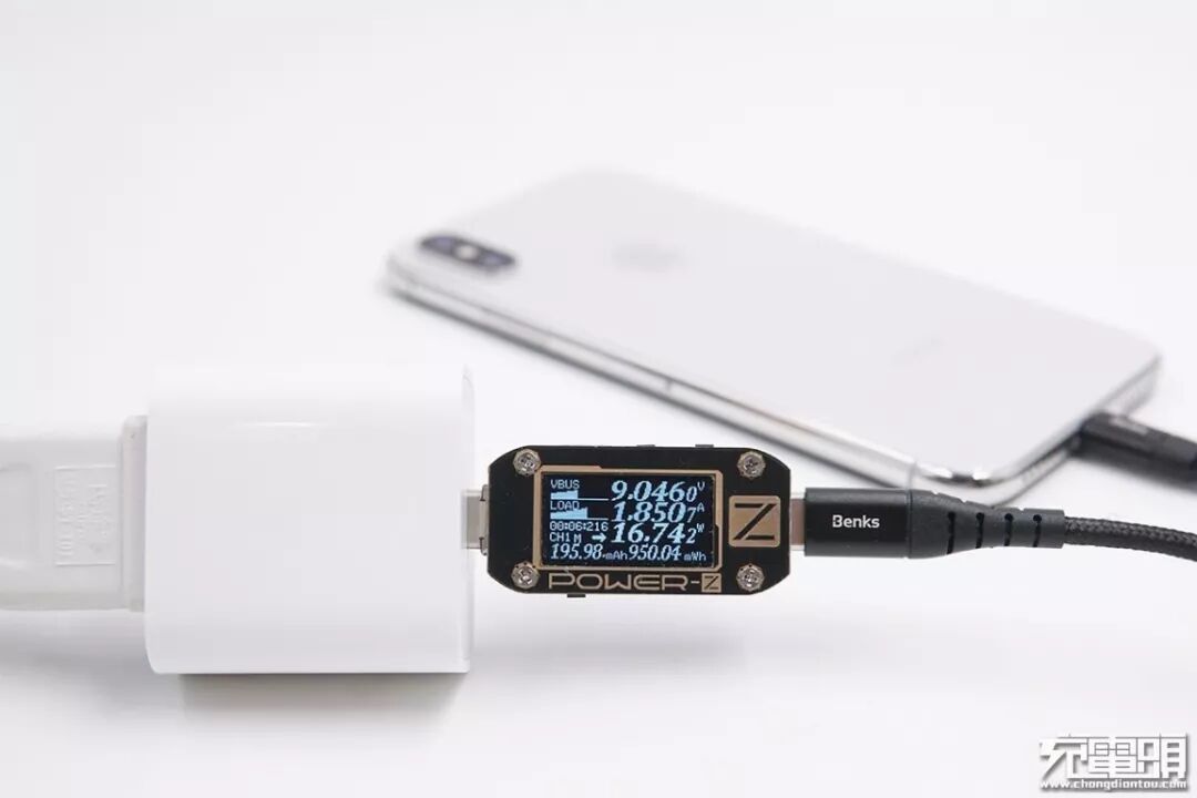 使用邦克士USB-C to Lightning数据线+苹果18W PD充电器给iPhone X充电,电压9.04V,电流1.85A,功率16.74W,开启PD快充。