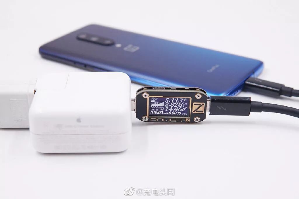昨天跟大家聊了下一加7Pro充电测试,刚好今天测了下兼容性,使用苹果30W PD充电器给它充电,实测可以达到5.1V/2.8A,功率约为14.5W左右。