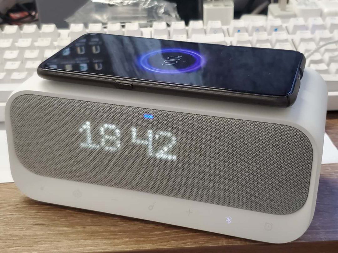 趁他要在拆解之前,小编迅速从他手中抢下体验一番。把手机与该音箱连上蓝牙,音箱前面的显示屏会同步显示手机上的时间。无线充电面板在音箱上方,“qi”标准,给无线充手机充电极为方便。