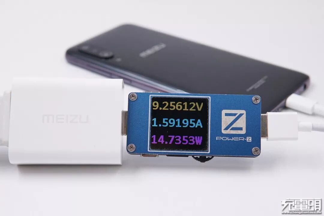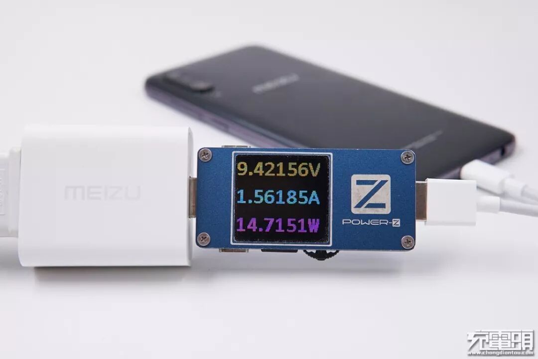 使用带有PE快充协议的魅族16th Plus原装充电器“UP1220S”给魅族16Xs充电,电压9.42V,电流1.56A,功率14.71W,16Xs当前充电开启PE快充。