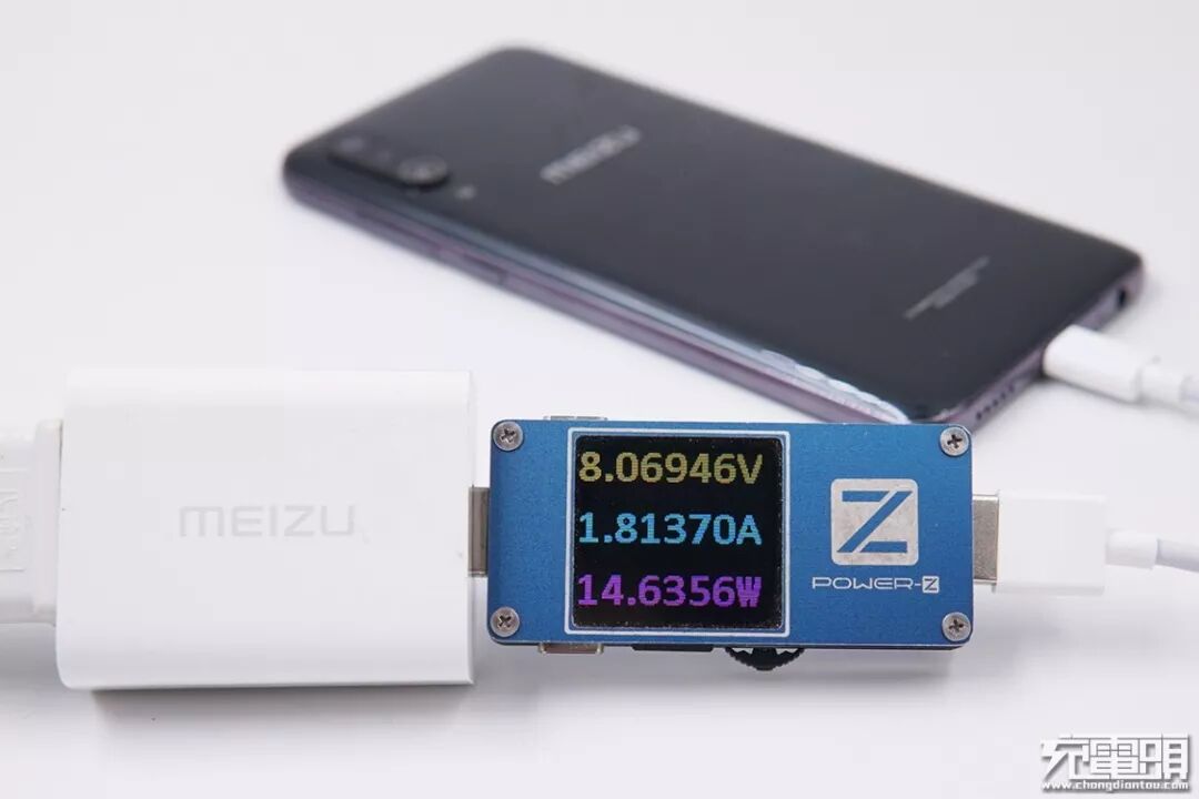 使用带有PE快充协议的魅族MX6原装充电器“UP1220”给魅族16Xs充电,电压8.06V,电流1.81A,功率14.63W,16Xs当前充电开启PE快充。