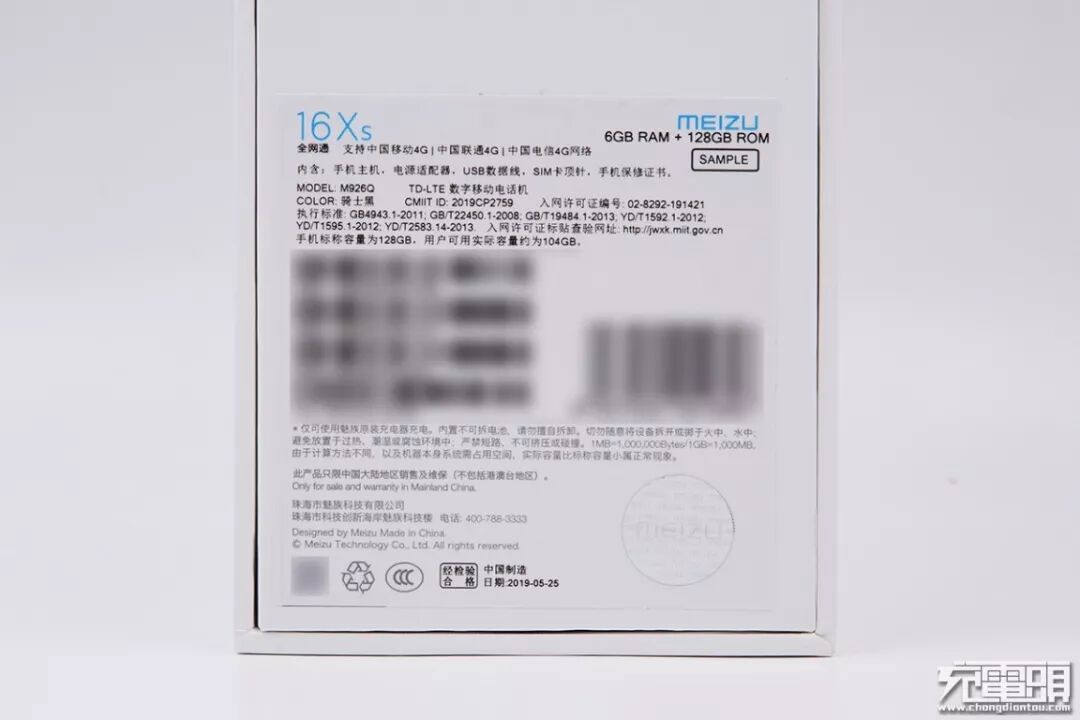 包装盒背面贴有一张印满技术参数的贴纸,右下角还有一枚反光防伪贴。我们拿到手这台机器生产日期为2019.05.25,版本是6GB RAM+128GB ROM。包装盒上有提示仅可使用原装充电器。难道充电还是这么坑爹吗?我们接着往下看。