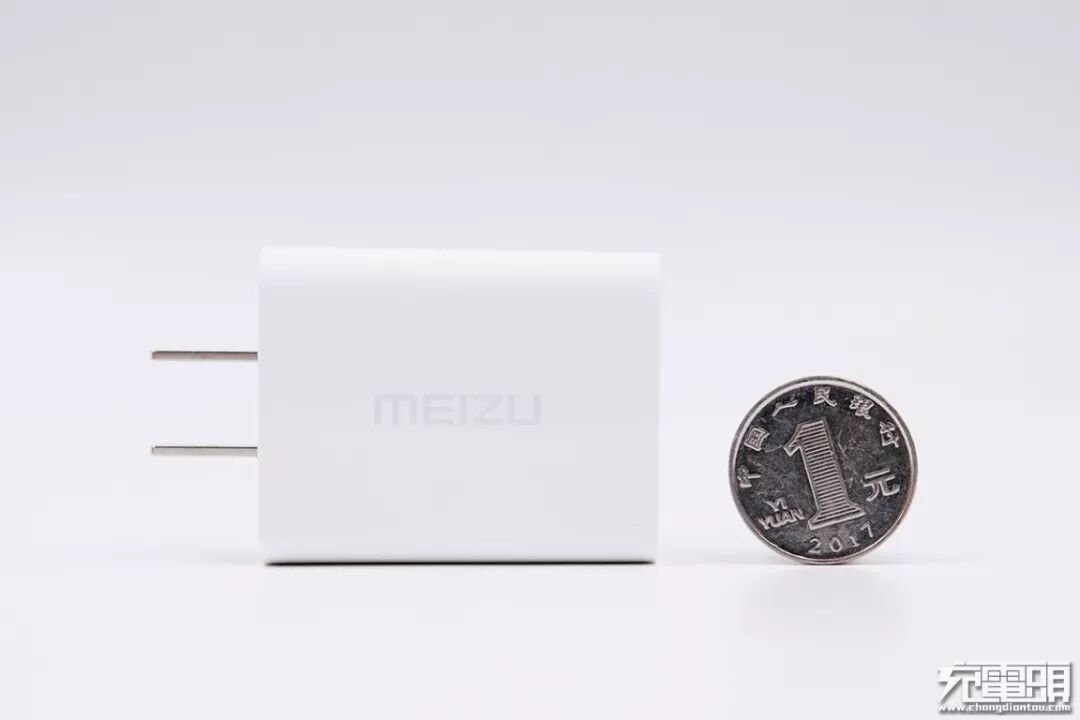 随机附送的USB-A口充电器,正面印有浅灰色“MEIZU”LOGO,体积比魅族其他充电器要小不少。