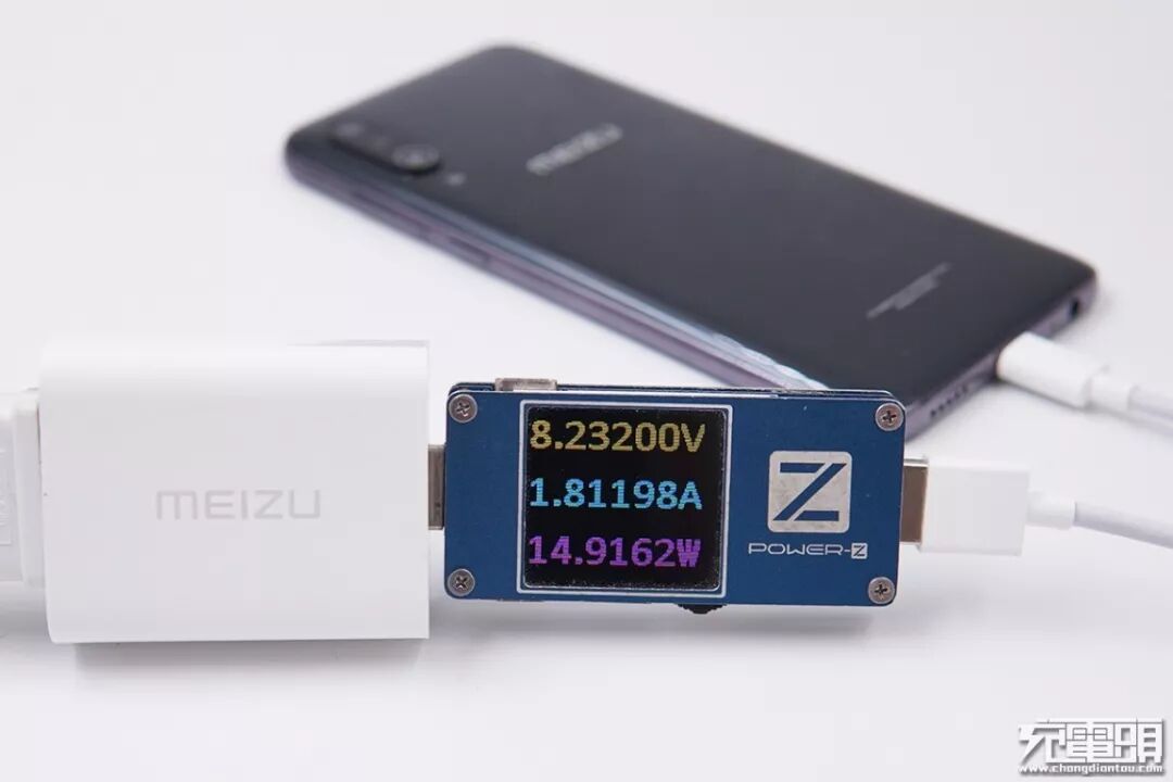 使用带有PE/QC快充协议的魅族PRO6原装充电器“UP0830”给魅族16Xs充电,电压8.23V,电流1.81A,功率14.91W,16Xs当前充电开启PE快充。