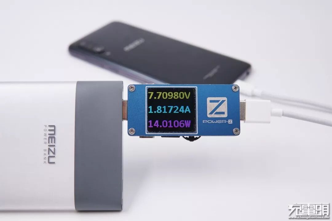 使用魅族M10移动电源给魅族16Xs充电,电压7.7V,电流1.81A,功率14.01W,开启PE快充。