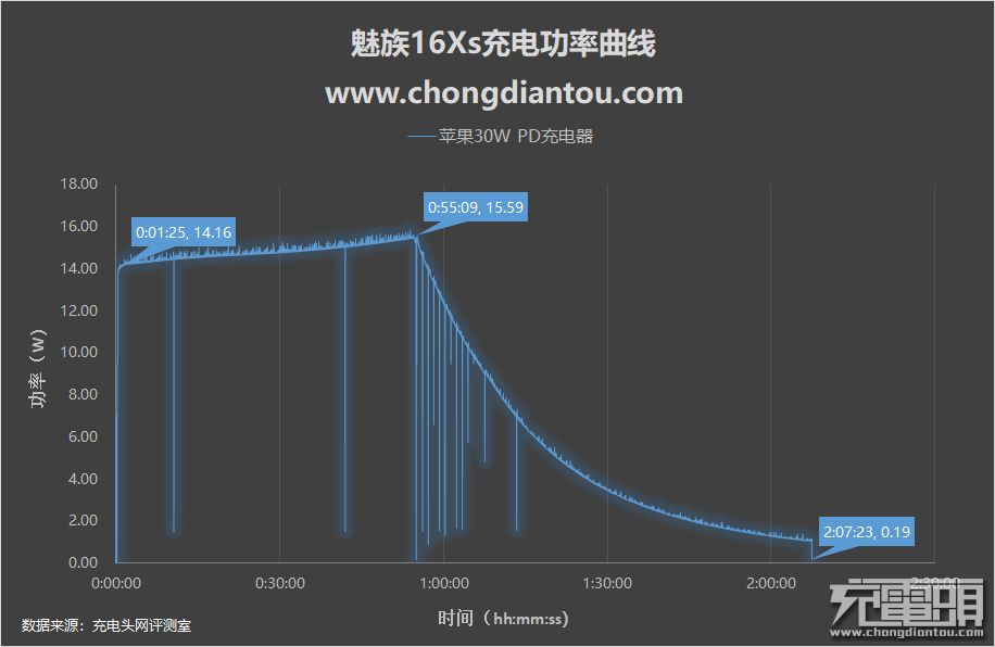最后来看下苹果30W PD充电器充魅族16Xs的表现:最高功率为15.59W,全程充电时间为2小时7分钟。